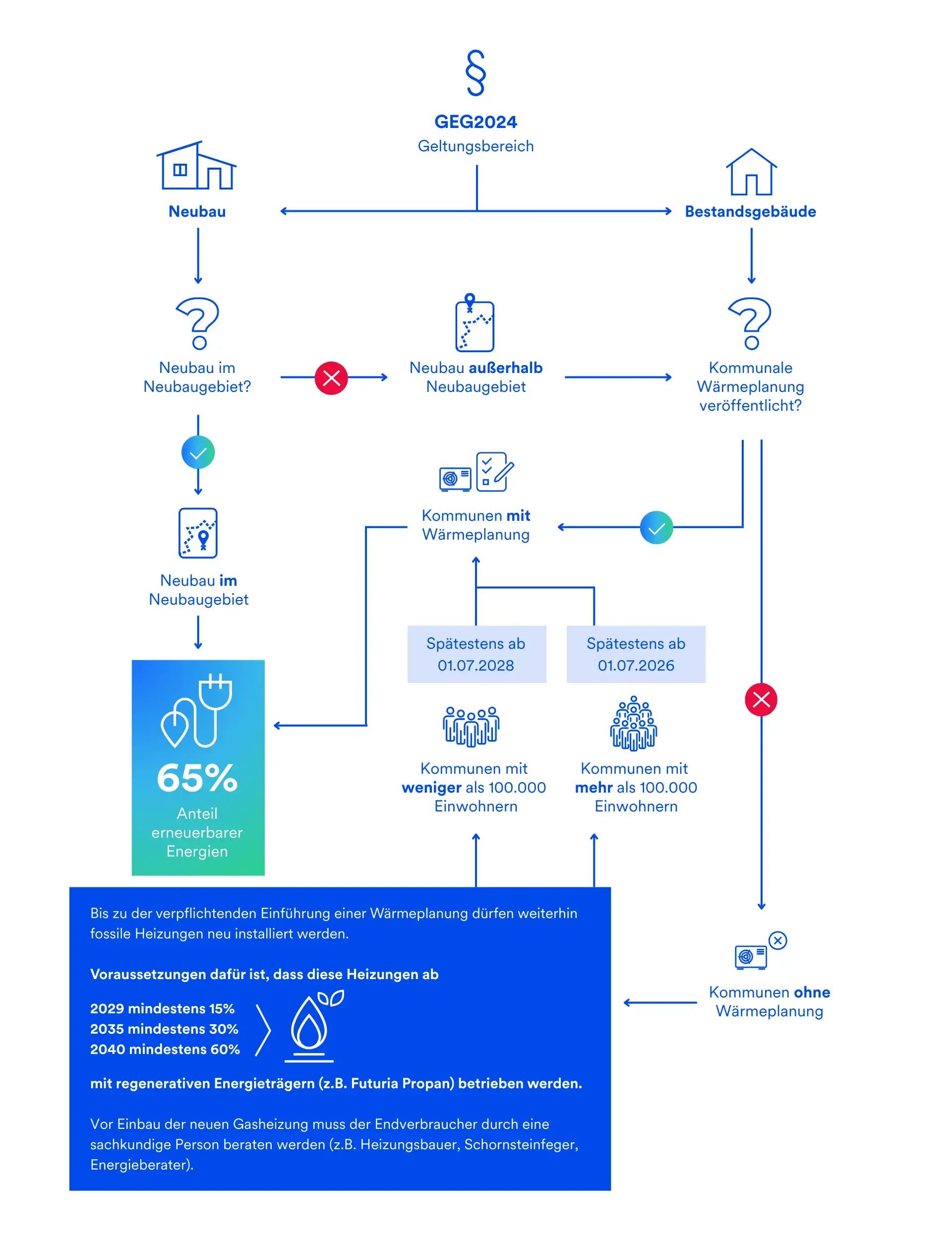 | Heizung wird ab 2024 ersetzt (freiwillig oder wegen Defekt) | 🔁 Ggf. ja | Dann gelten die neuen 65 Prozent-EE-Vorgaben – abhängig vom Standort und Wärmeplanung. |