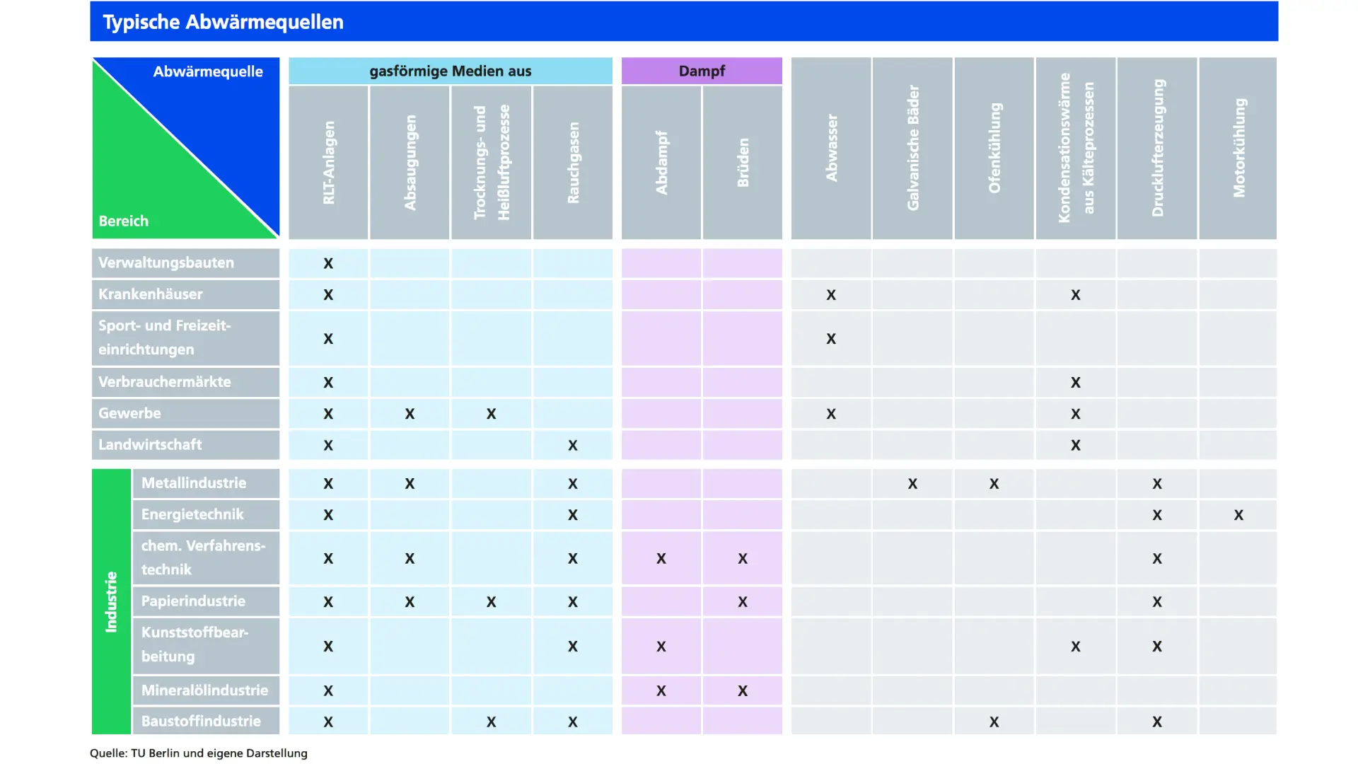 Wärmepumpen nutzen die Temperatur einer Wärmequelle für das Heizen von Gebäuden oder für die Erzeugung von Prozesswärme. Die technologische Vielfalt ist hierbei groß, sodass sich auch Abwärme als eine Quelle geeignet sein kann.