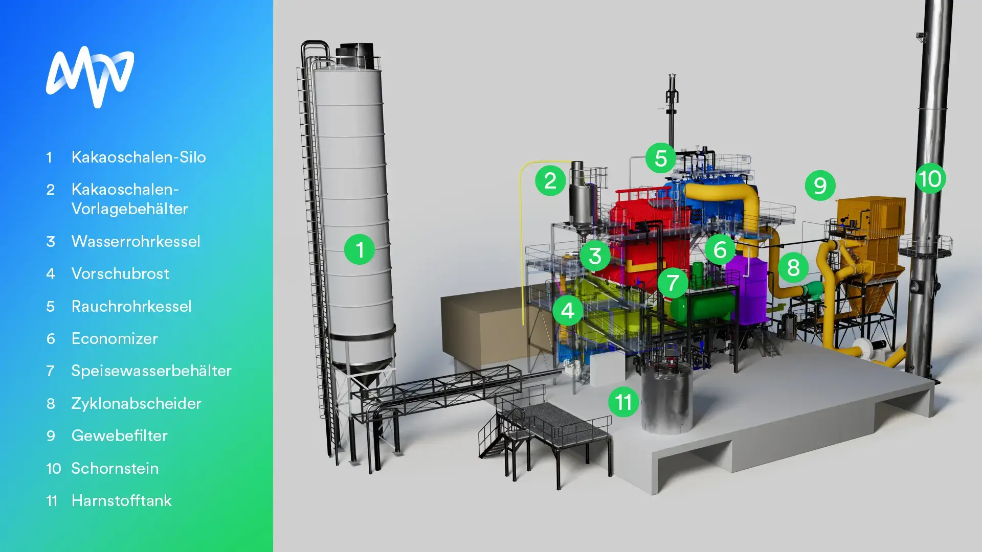 Aus dem Kakaoschalen-Silo (1) werden die Schalen in den Vorlagebehälter (2) geblasen und hier gesammelt. Mittels Schnecken gelangen sie auf den Vorschubrost (4) und in den Wasserrohrkessel (3), wo sie verbrannt werden. Das dabei entstehende, 800 Grad Celsius heiße Rauchgas wird durch einen Rauchrohrkessel (5) geleitet. So wird der gewünschte Dampf erzeugt.